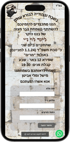 לפעמים אנחנו שומעים מי שחושבים שאם מדובר על אירוע קטן לבר מצווה, אז אין צורך בהזמנה דיגיטלית לבר מצווה. לעניות דעתנו זה לא נכון. כל אירוע הוא אירוע, בין אם מדובר על אירוע בפורום מצומצם ובין אם מדובר על אירוע במסגרת רחבה יותר. בנוסף, אנחנו ממליצים להיעזר במערכת מיוחדת עבור אישורי הגעה דיגיטליים. כמו שההזמנה נשלחת בוואצאפ אוטומטי לטלפונים של האורחים, כך גם מערכת לאישורי הגעה. האורחים מצידם יכולים לאשר הגעה לאירוע, בה יעדכנו כמה מוזמנים שיגיעו מספר טלפון ושמות. מהצד שלכם, תקבלו גישה לאזור האישי עם סיסמא ייחודית, כך שתמונת האורחים הרלוונטית תהיה כל הזמן לנגד עיניכם וגם תינתן לכם אפשרות לערוך את הרשימה בכל רגע נתון. וללא הגבלה של אורחים!