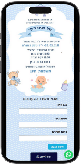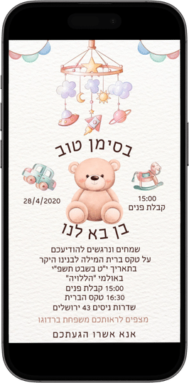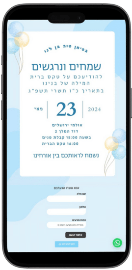 הבעיה עם הודעה או הזמנה לברית מילה, היא שמדובר על אירוע אותו אי אפשר לתכנן פרק זמן ארוך מראש. הרי אף אחד לא יכול לנבא את תאריך הלידה המדויק. מה גם שאם יש עניין רפואי, לעיתים האישור לערוך ברית מילה מגיע ממש בדקה התשעים. כך שהניסיון לתכנן את האירוע הופך מורכב בהרבה וכאן המקום של הטכנולוגיה להיכנס ולפתור את הבעיה. בעזרת הזמנה דיגיטלית לברית מילה, ההודעה (ההזמנה) על מועד האירוע מגיע לטלפון של כל אחד. בזכות מערכת יעילה ונוחה לשימוש, תהיה לכם האפשרות לשלוח את ההזמנה בלי לקום מהספה.